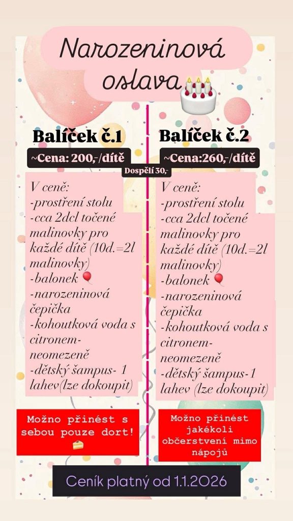 • V případě balíčku č.1 –> Na oslavu je možné přinést si vlastní dort. Je zakázáno vnášet jakékoliv nápoje (mimo kojenecké stravy), slané pečivo, brambůrky, křupky, tyčky atd. Tyto jsou možné koupit u nás v Hopíku. Dále je možné u nás zakoupit občerstvení, které máme standartně v nabídce (PIZZA, hranolky, bramboráčky, utopence, nakládaný Hermelín,…).